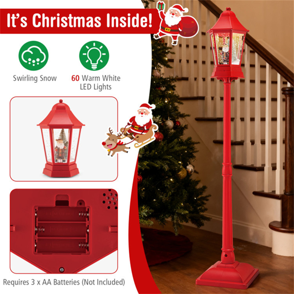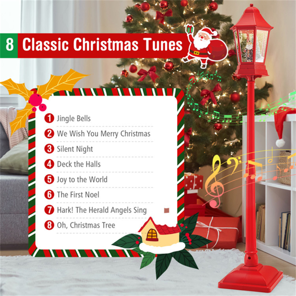 ● Festive Scene Inside: This Christmas-themed streetlamp features a lively scene of Santa and a gift box/snowman in front of a Xmas tree, brightly lit with 60 warm white led lights.  Enhanced with swirling snows and jolly music, it creates a magical holiday centerpiece full of festive spirit.