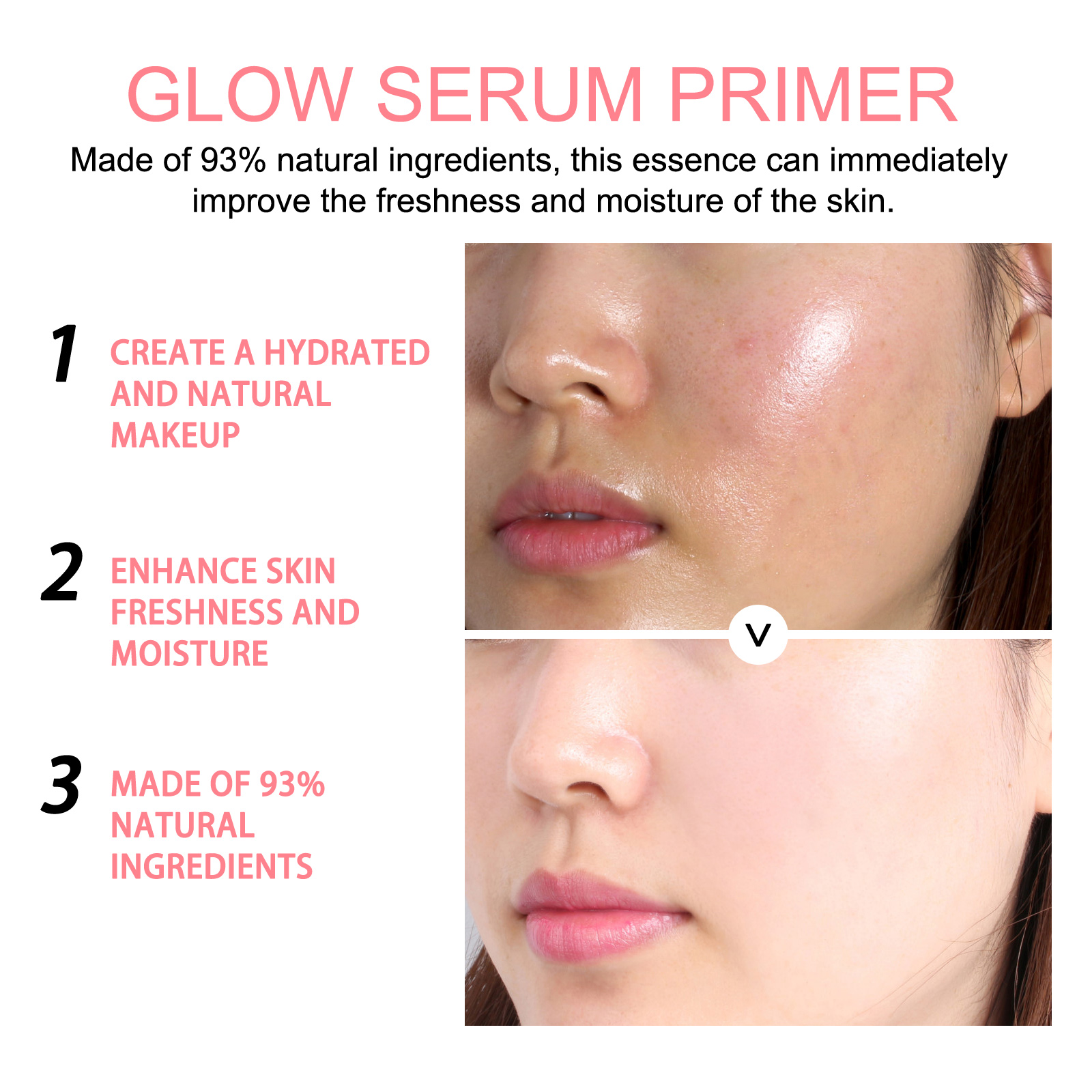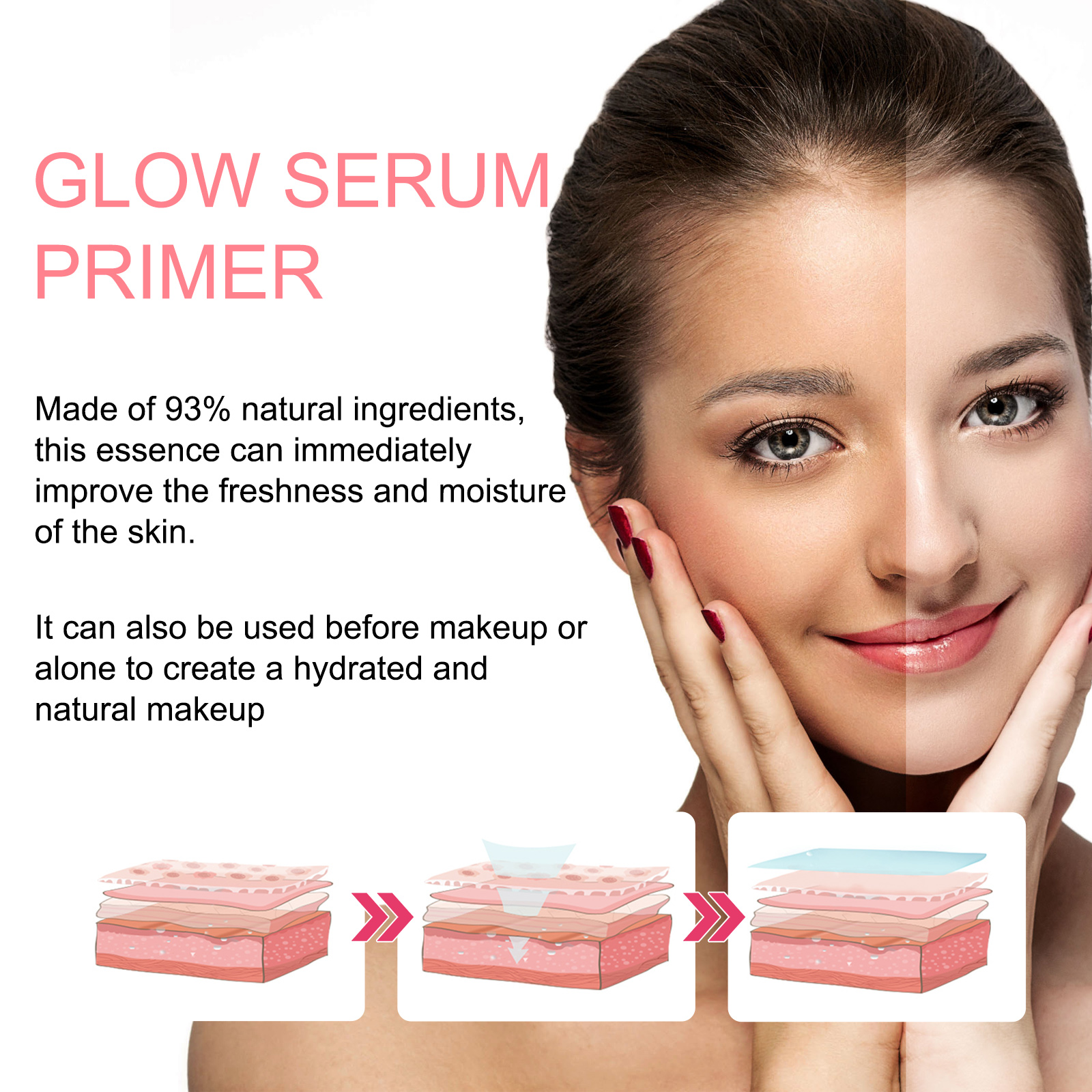 Our luminous serum serum contains water, nicotinamide, watermelon extract. It helps to lighten and hydrate the skin. Its application is simple: apply it to clean dry skin before applying makeup to create a natural and healthy glow. It can be used before makeup or on its own as part of a daily skincare routine. After use creates a moisturizing and natural makeup that enhances the skin's freshness and moisture.