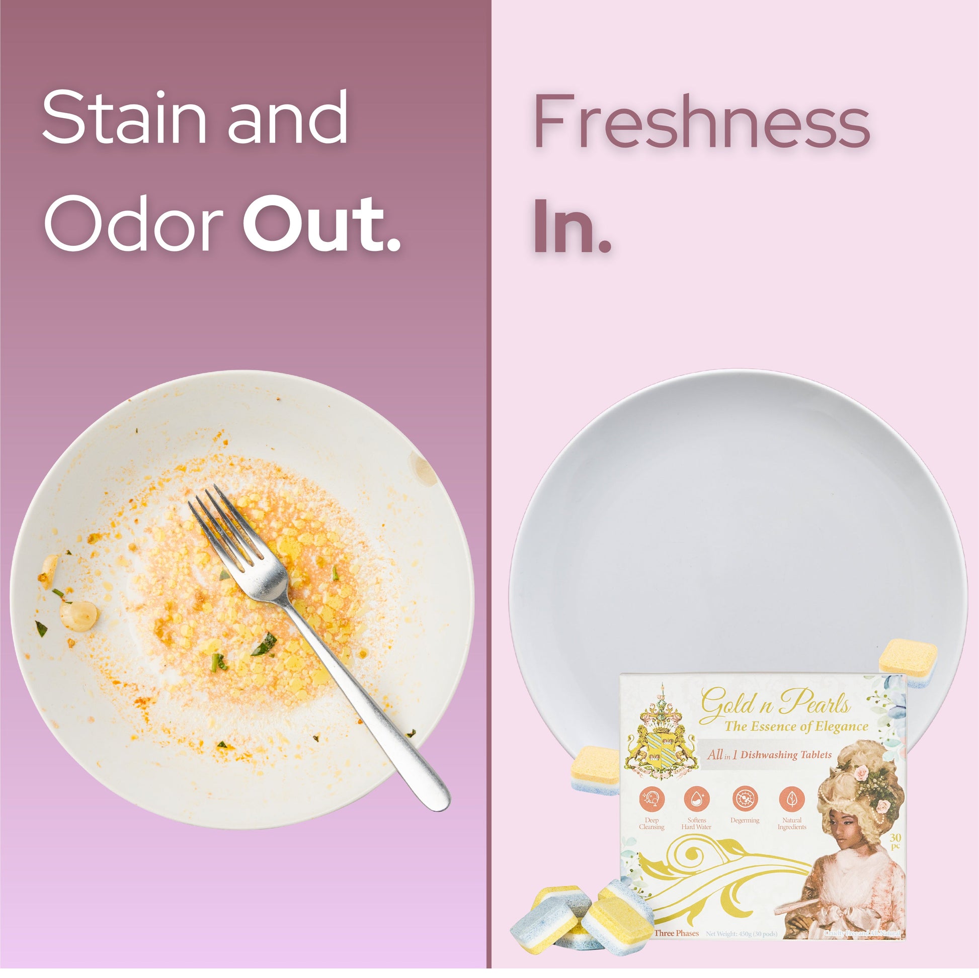 Gold n Pearls 3-Layer Dishwashing Tablets bring sophistication to the sink. Each tablet is pre-measured and individually wrapped, offering a seamless, mess-free experience with every use.