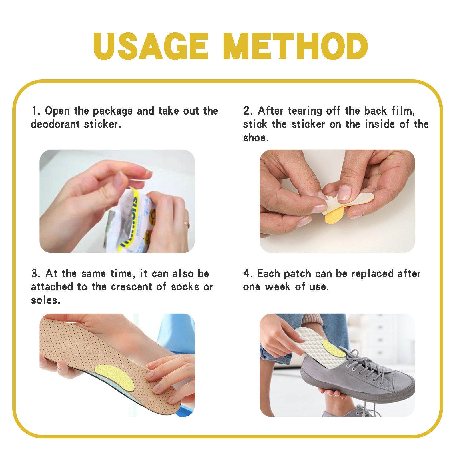 Our shoe deodorizing patch contains lemon extract, lavender, and snake bed seeds. It can sterilize and deodorize shoes and socks, removing odors caused by sweating. Its usage is very simple: open the package, take out the deodorizer sticker, peel off the back film, and stick the sticker on the inside of the shoe, or it can also be attached to the crescent of the sock or sole. Each patch can be replaced after one week of use. Absorb foot sweat, eliminate shoe odor after exercise, and keep the inside of the shoes dry and fresh.