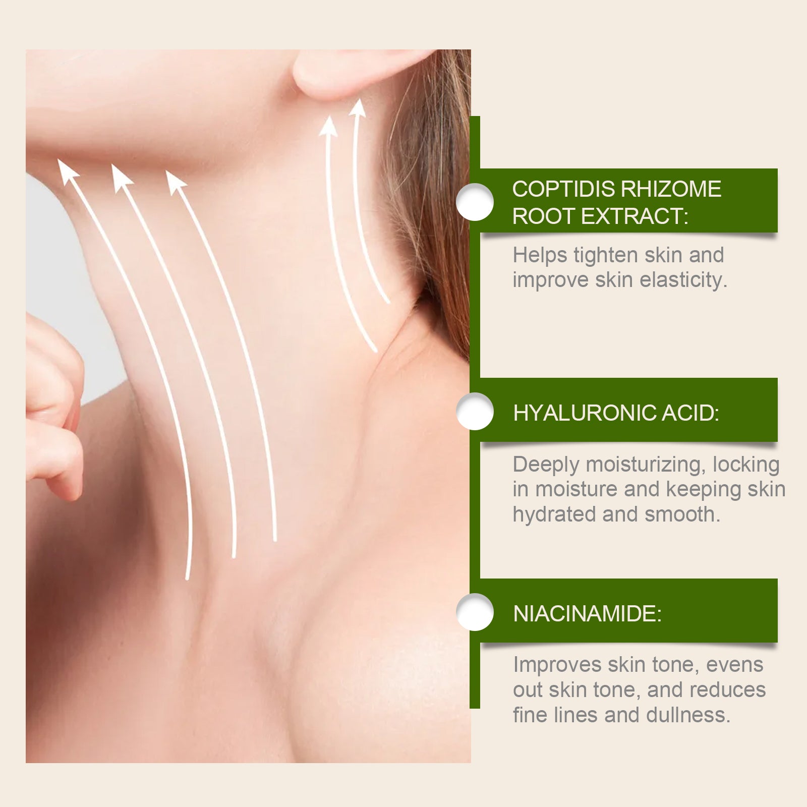 Our firming cream is carefully formulated with hyaluronic acid, niacinamide and Coptis root extract. Designed specifically to accelerate fat metabolism and shape a firm figure. The usage method is extremely convenient: Clean and dry the skin on your body. Take an appropriate amount of the face cream and apply it evenly to the neck, chest, arms, abdomen, legs and other areas. Gently massage in circular motions with your hands to absorb it. And it can effectively lift the skin and improve sagging.