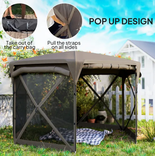 • - Mesh sidewalls with roll-up wind panels enhance airflow and privacy